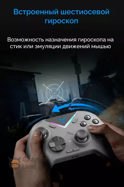 - встроенный 6-осевой гироскоп позволяет эмулировать различные игровые действия: доцеливание, вращение камеры, управление автомобилем;