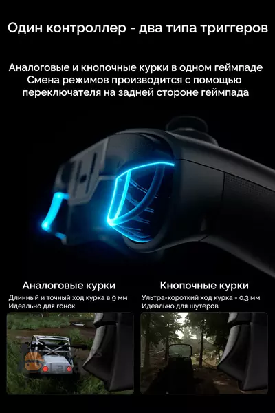 - инновационные триггеры на основе датчиков Холла с двумя режимами работы — теперь игрок может переключить триггер в аналоговый режим для игры в гоночные симуляторы (Need For Speed, Forza, Burnout, F1), или в режим кнопки для шутеров или файтингов;